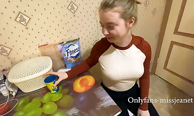 gross barbudo abuelo pulveriza adolescente cutie en la cocina