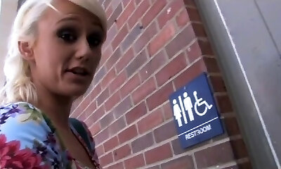 युवा सुनहरे बालों वाली शहद डीप थ्रोटिंग और पंगा लेना शौचालय में