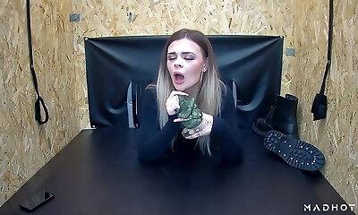 गोरा अनुभवहीन एक उत्कृष्ट दिखाने के लिए Gargling गुलाबी सिगार के माध्यम से-छेद